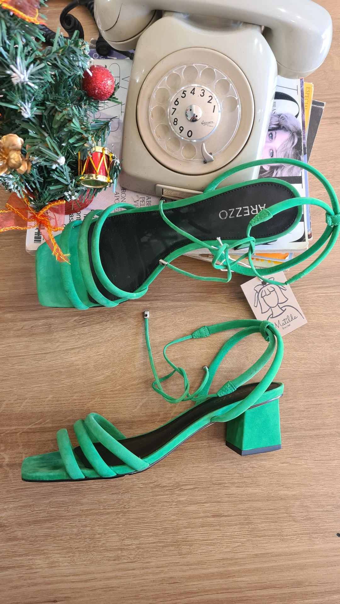 Sandália Arezzo salto quadrado com amarração no tornozelo.