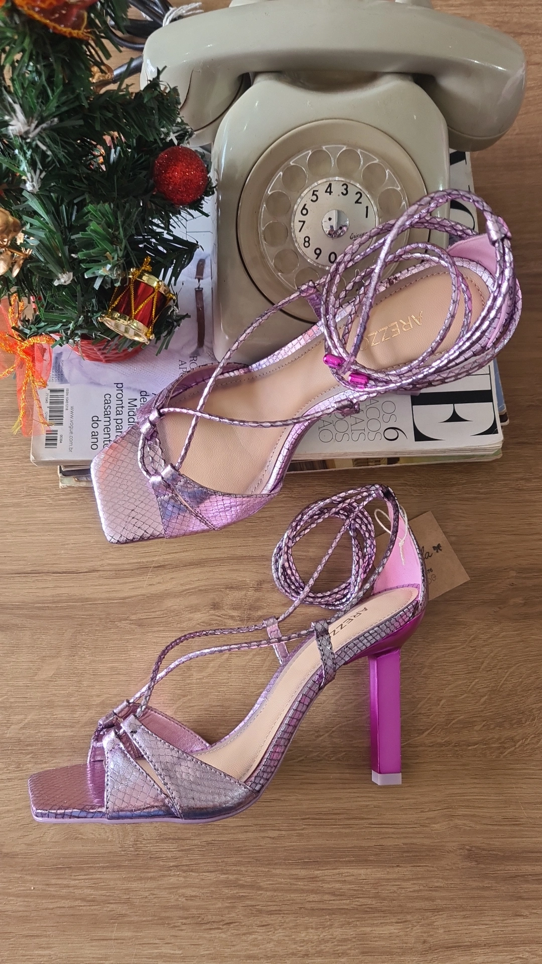 Sandália metálica com amarração no tornozelo, da marca Arezzo.